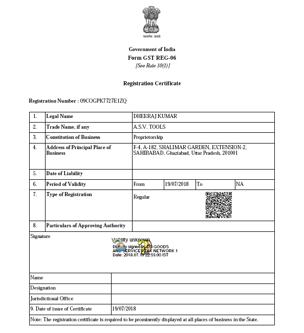 Registration cum GST Certificate